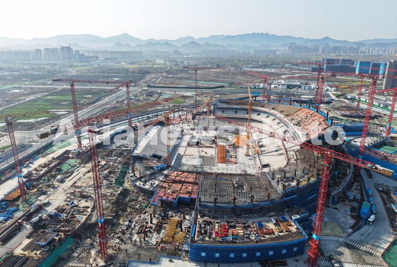 图片说明:2025年3月22日,杭州余杭国际体育中心专业足球场建设现场塔吊林立, 一片繁忙施工景象。