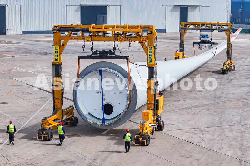 图片说明:2025年3月24日,山东省荣成市石岛管理区的海上风电产业基地,工人在吊装、运输超大型风电叶片。
