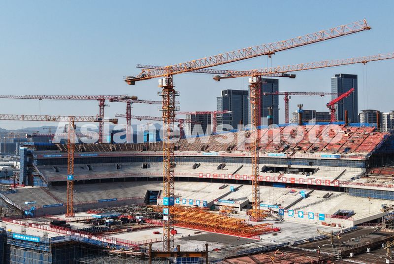 图片说明:2025年3月22日,杭州余杭国际体育中心专业足球场建设现场塔吊林立, 一片繁忙施工景象。
