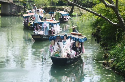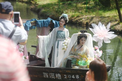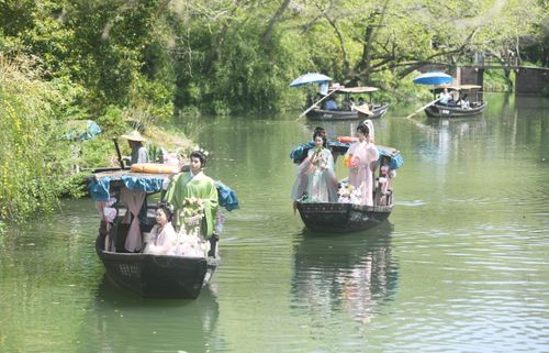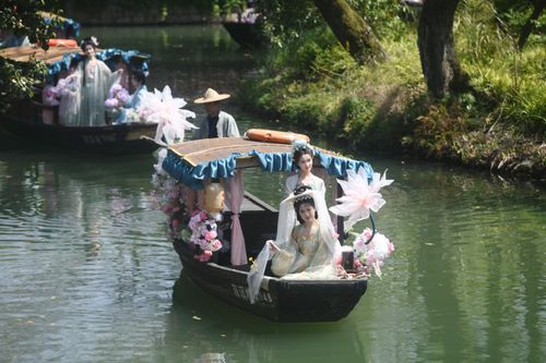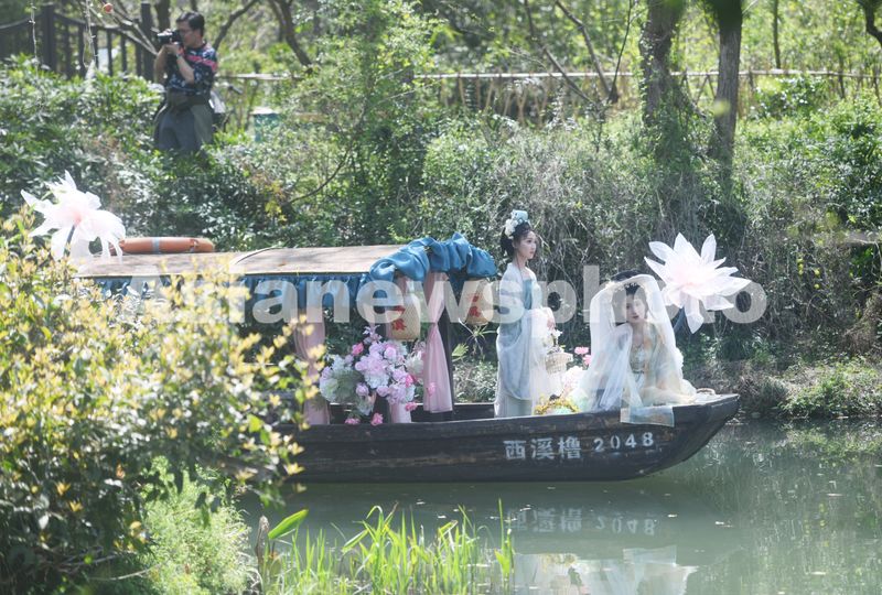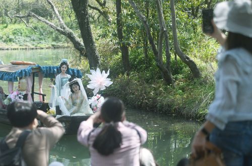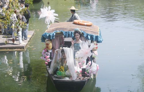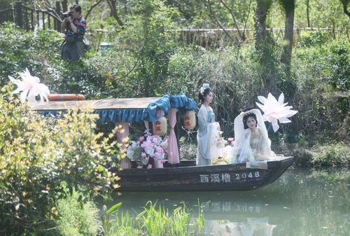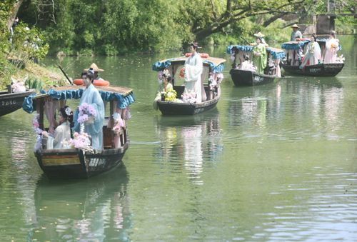 2025年3月24日,由汉服爱好者扮演的“十二花神”乘座“摇橹花船”泛舟杭州西溪湿地与市民游客共庆“花朝节”。