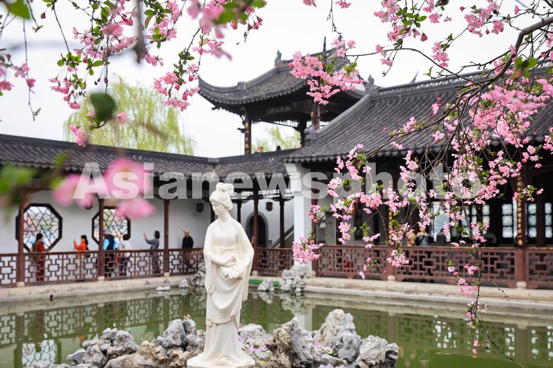 3月23日,游客在南京莫愁湖公园赏花游玩。