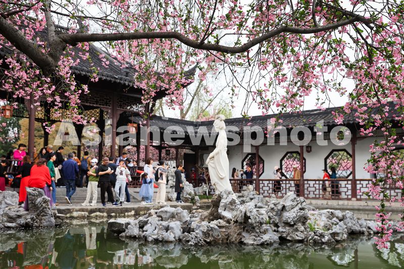 3月23日,游客在南京莫愁湖公园赏花游玩。