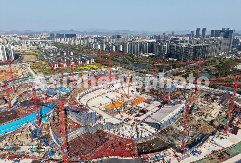 图片说明:2025年3月22日,杭州余杭国际体育中心专业足球场建设现场塔吊林立, 一片繁忙施工景象。