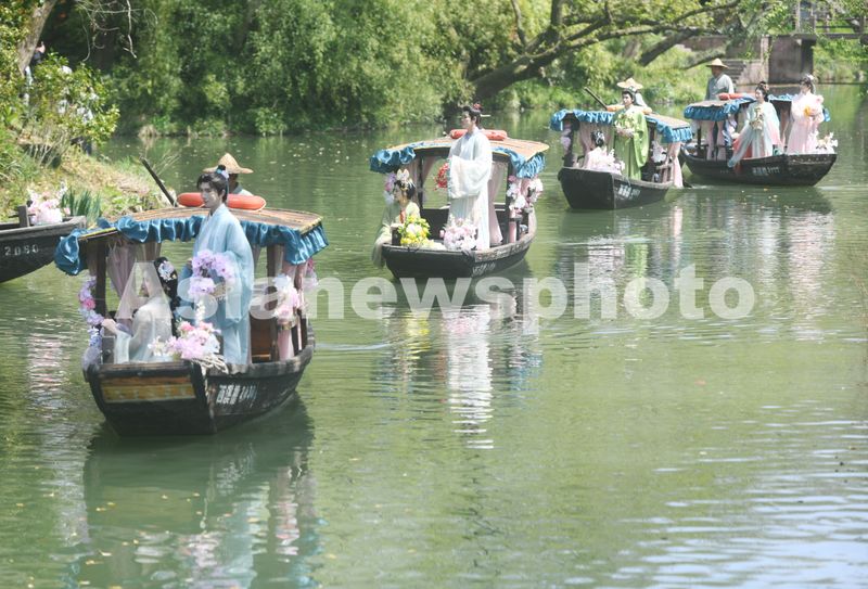2025年3月24日,由汉服爱好者扮演的“十二花神”乘座“摇橹花船”泛舟杭州西溪湿地与市民游客共庆“花朝节”。