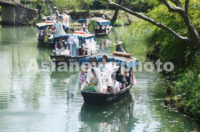 2025年3月24日,由汉服爱好者扮演的“十二花神”乘座“摇橹花船”泛舟杭州西溪湿地与市民游客共庆“花朝节”。