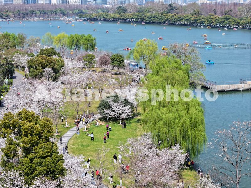 2025年3月22日,江苏南京玄武湖公园春意盎然,樱花绽放,柳枝吐绿,吸引众多游客前来踏青赏花,尽享美好春光。