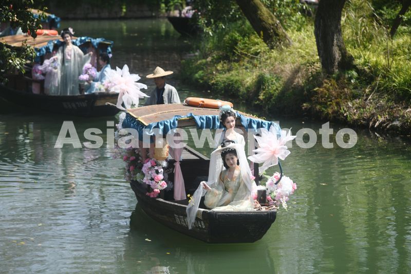 2025年3月24日,由汉服爱好者扮演的“十二花神”乘座“摇橹花船”泛舟杭州西溪湿地与市民游客共庆“花朝节”。