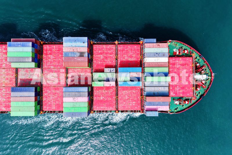 2025年3月24日,山东港口青岛港,装载外贸集装箱的货轮驶出港口。