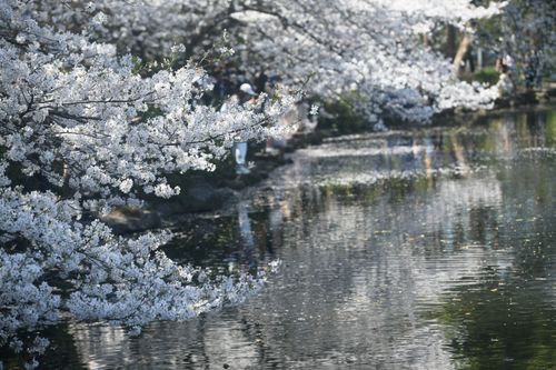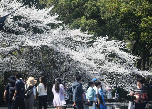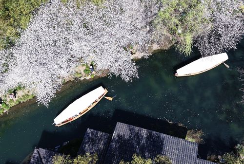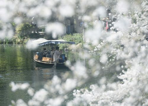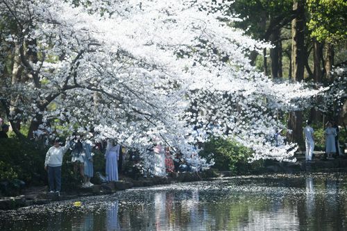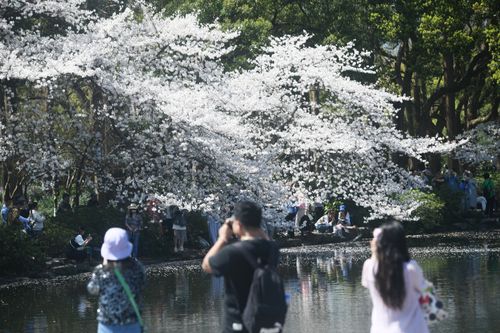 2025年3月25日,游客在杭州西湖曲院风荷观赏盛开的樱花。 近日,杭州西湖樱花迎来盛花期,吸引了不少市民和游客前来观赏这如雪般的樱花所带来的春日美景。