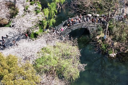 2025年3月25日,游客在杭州西湖曲院风荷观赏盛开的樱花。