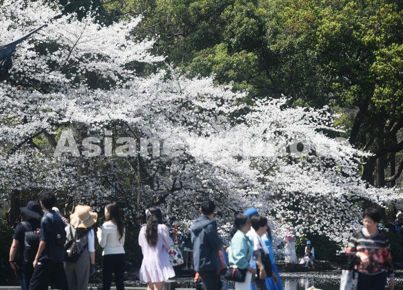 2025年3月25日,游客在杭州西湖曲院风荷观赏盛开的樱花。
