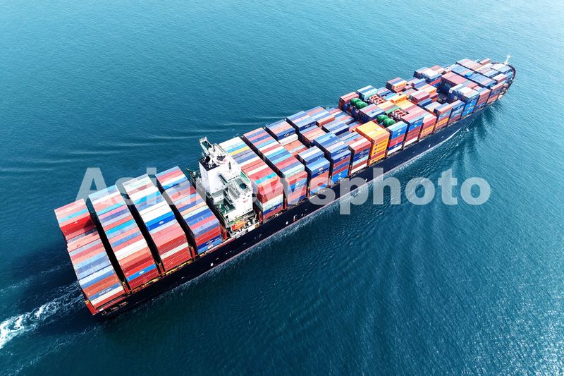 2025年3月24日,山东港口青岛港,装载外贸集装箱的货轮驶出港口。