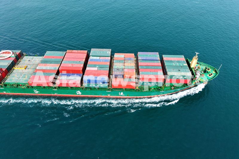 2025年3月24日,山东港口青岛港,装载外贸集装箱的货轮驶出港口。