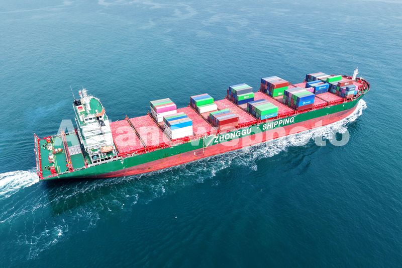 2025年3月24日,山东港口青岛港,装载外贸集装箱的货轮驶出港口。