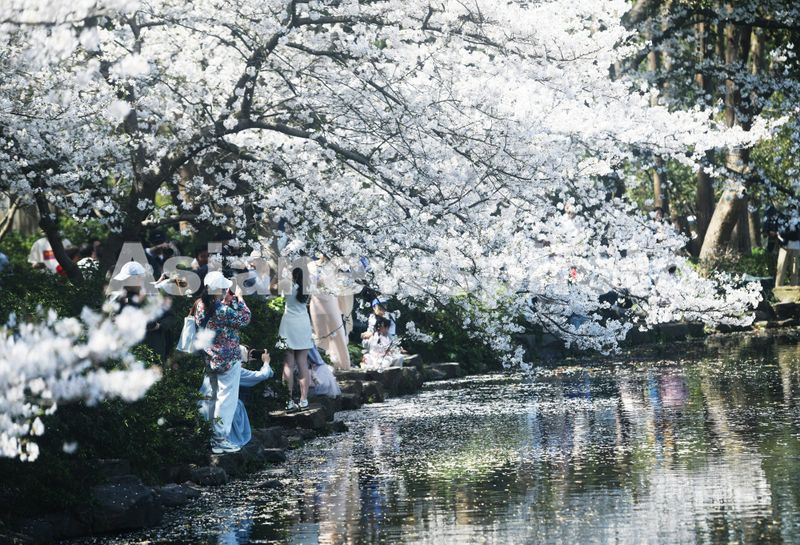 2025年3月25日,游客在杭州西湖曲院风荷观赏盛开的樱花。