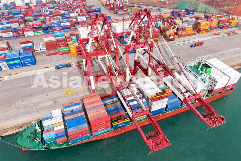 2025年3月24日,山东港口青岛港,货轮在装卸外贸集装箱。