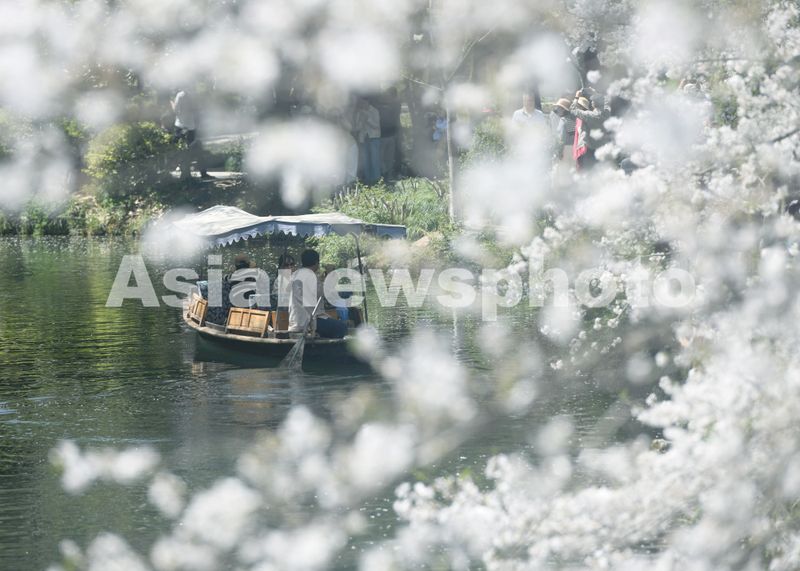 2025年3月25日,游客在杭州西湖曲院风荷观赏盛开的樱花。