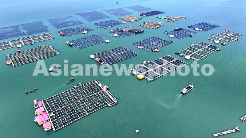2025年3月26日,在福建省宁德市蕉城区白基湾海域的海洋牧场,养殖工人在海上生产作业。