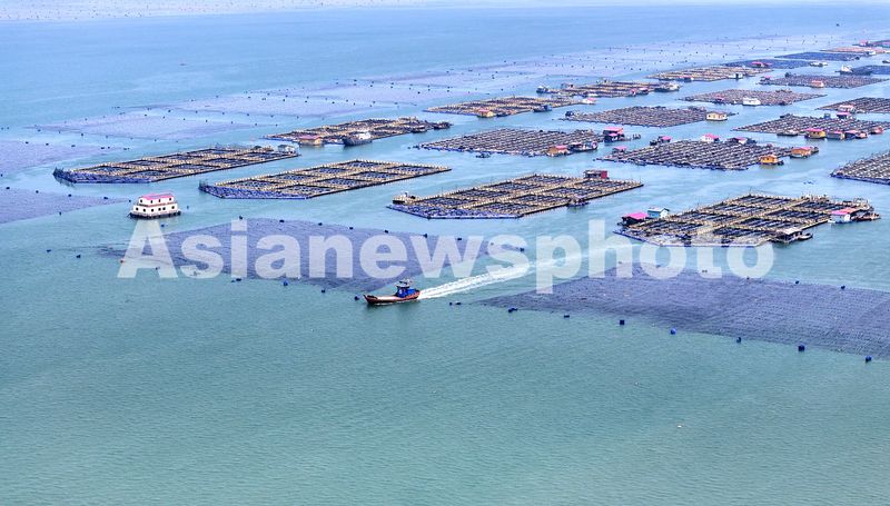 2025年3月26日,在福建省宁德市蕉城区白基湾海域的海洋牧场,养殖工人在海上生产作业。