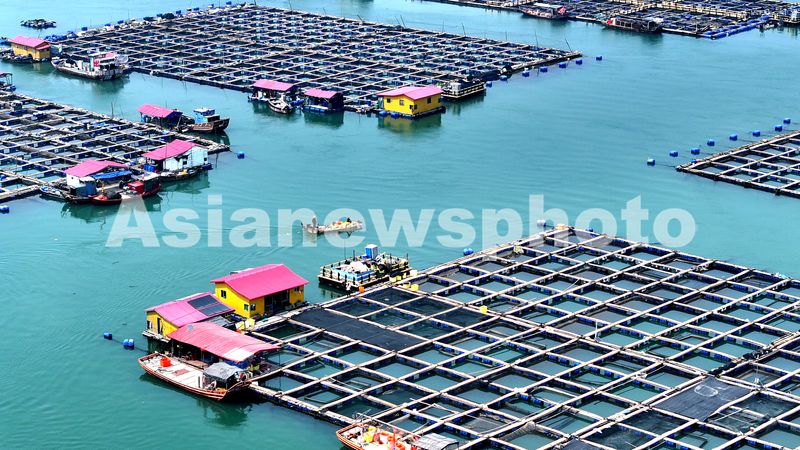 2025年3月26日,在福建省宁德市蕉城区白基湾海域的海洋牧场,养殖工人在海上生产作业。