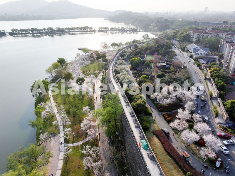 2025年3月26日,江苏省南京市,近日,玄武湖公园樱花盛开,垂柳翠绿,一派春和景明。