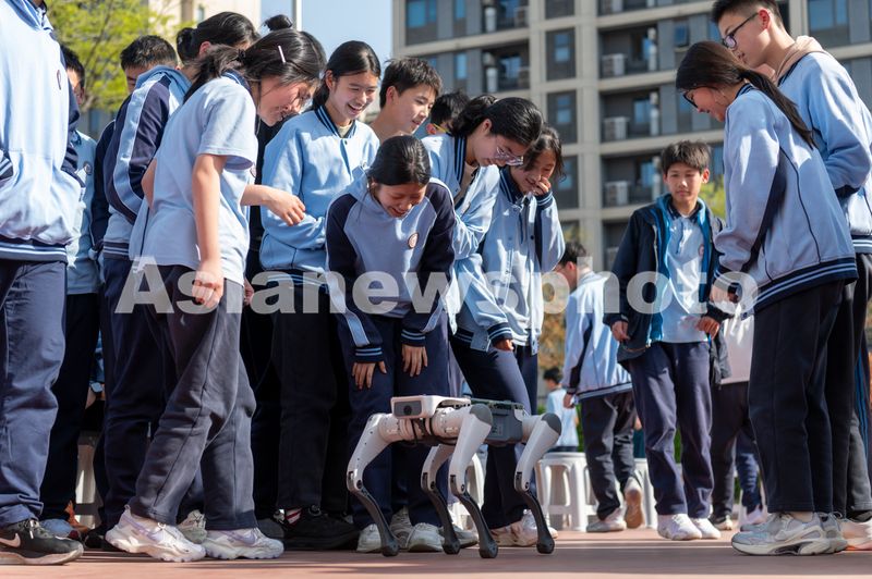 图片说明:2025年3月24日,浙江省金华市丽泽中学校园内,学生和一只消防机器狗近距离接触。