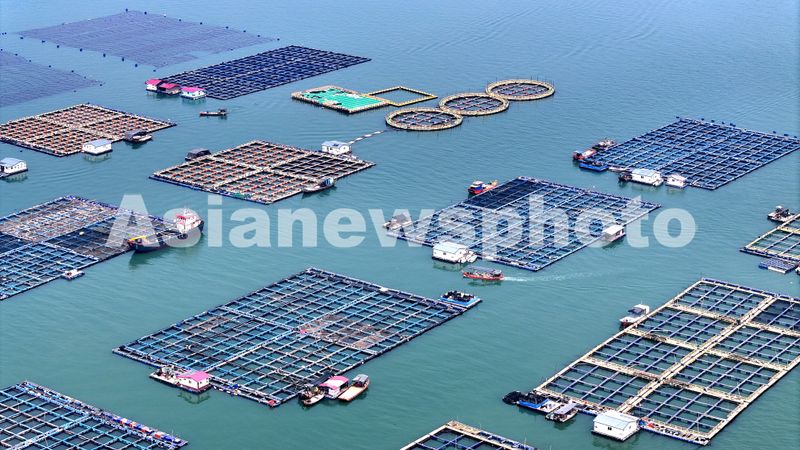 2025年3月26日,在福建省宁德市蕉城区白基湾海域的海洋牧场,养殖工人在海上生产作业。