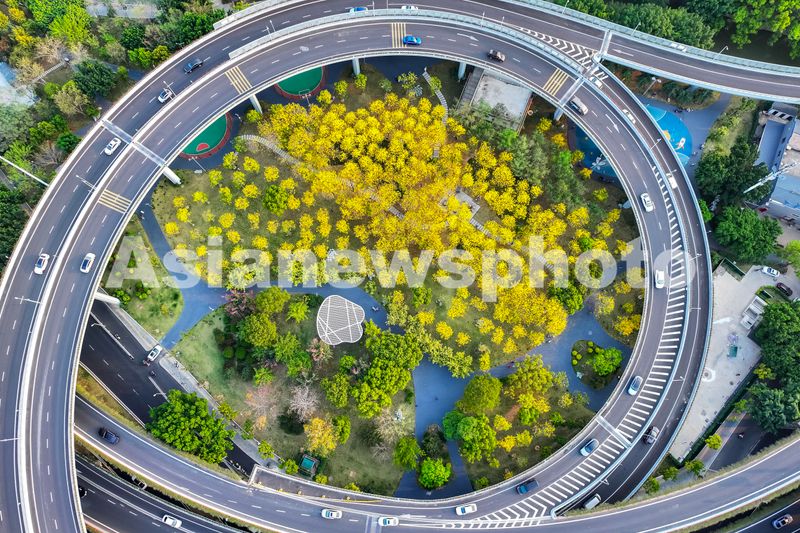 图片说明:2025年3月26日,福建省福州市仓山区的黄花风铃木公园,空中俯瞰犹如城市盆景的黄花风铃木。(无人机照片)