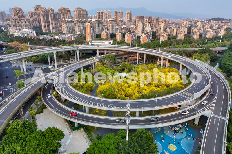 图片说明:2025年3月26日,位于福建省福州市仓山区的黄花风铃木公园,园内700多株黄花风铃木竞相绽放,新增的儿童乐园、篮球场等休闲设施,成为市民春日踏青、休闲的好去处。(无人机照片)