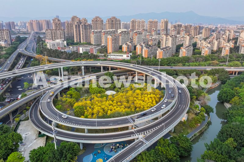 图片说明:2025年3月26日,位于福建省福州市仓山区的黄花风铃木公园,园内700多株黄花风铃木竞相绽放,新增的儿童乐园、篮球场等休闲设施,成为市民春日踏青、休闲的好去处。(无人机照片)