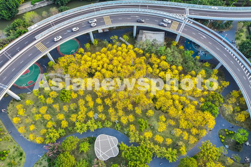 图片说明:2025年3月26日,福建省福州市仓山区的黄花风铃木公园,空中俯瞰犹如城市盆景的黄花风铃木。(无人机照片)
