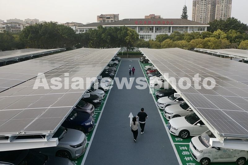2025年3月12日,工人在四川省遂宁市环岛商务中心新建的“光储充享”一体化示范项目上安装光伏发电太阳能板。