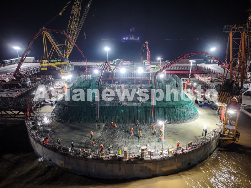 图片说明:2025年3月26日深夜,甬舟铁路西堠门公铁两用大桥4号主塔承台第二层混凝土正在进行最后的浇筑。