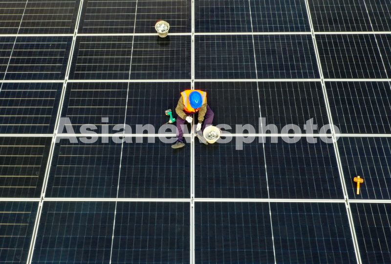 2025年3月12日,工人在四川省遂宁市环岛商务中心新建的“光储充享”一体化示范项目上安装光伏发电太阳能板。