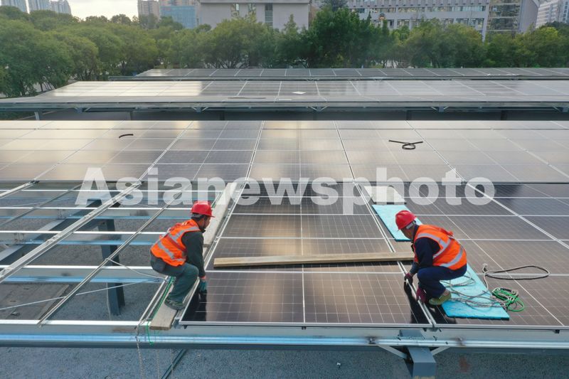 2025年3月12日,工人在四川省遂宁市环岛商务中心新建的“光储充享”一体化示范项目上安装光伏发电太阳能板。