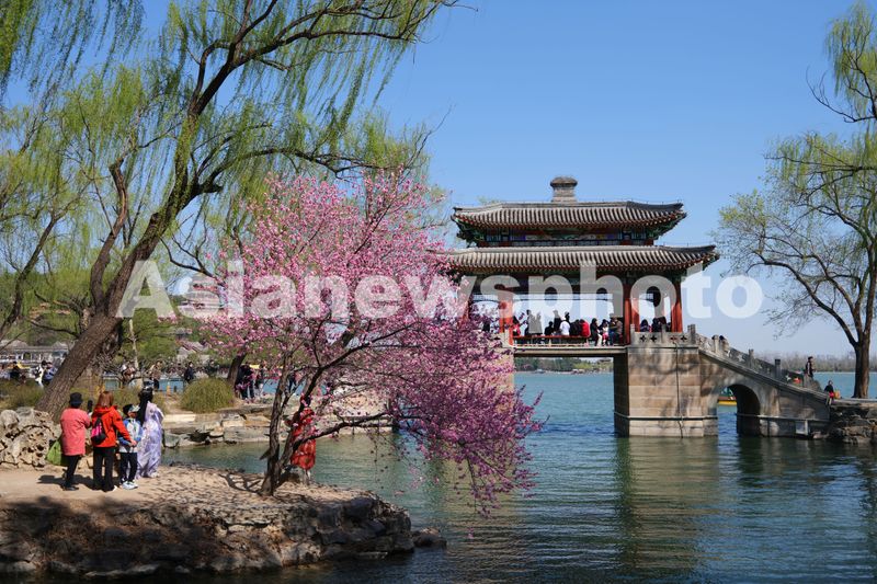 图片说明:2025年3月30日,北京颐和园内桃花竞相绽放,在碧水、翠柳映衬下,色彩艳丽,景美如画,吸引了大批游客前来观赏、拍照。