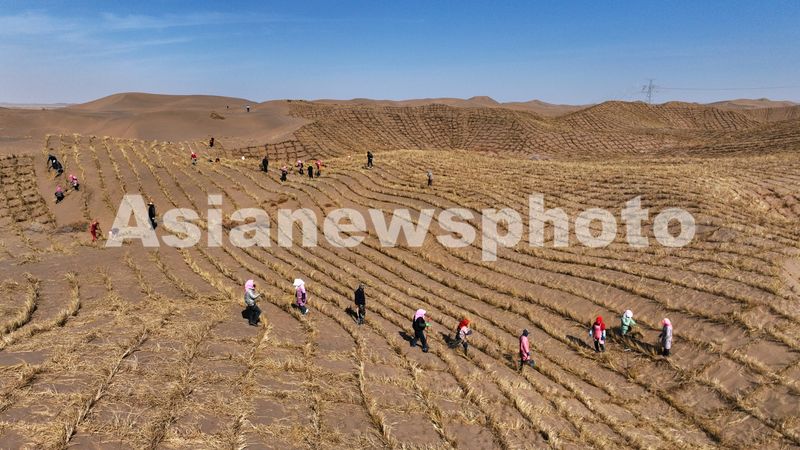 2025年3月29日,治沙人员在沙漠中设置“草方格”。