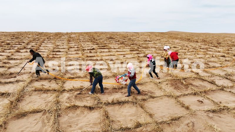 连日来,甘肃张掖市北部高台县、临泽县北部沙漠地区掀起防沙压沙攻坚战,工作人员在沙漠里设置“草方格”压沙固沙,连绵的沙丘被草方格牢牢锁住,草方格中间是一棵棵梭梭幼苗。
