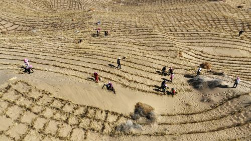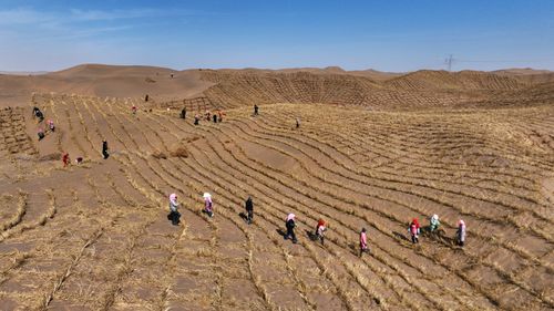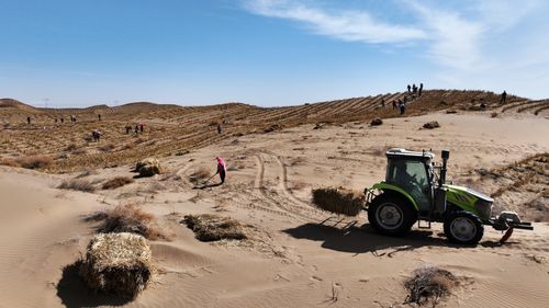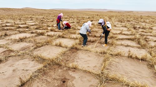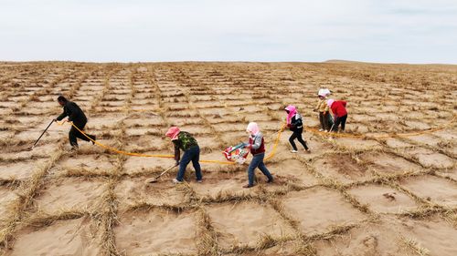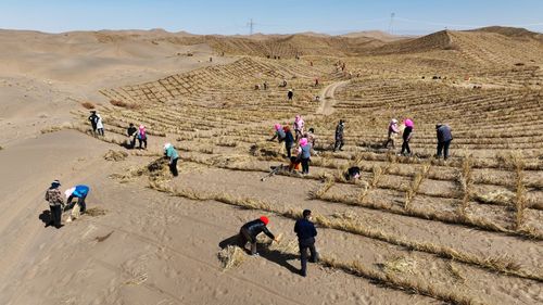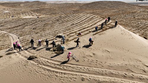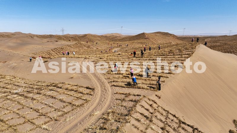 2025年3月29日,治沙人员在沙漠中设置“草方格”。
