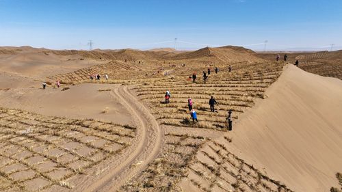 连日来,甘肃张掖市北部高台县、临泽县北部沙漠地区掀起防沙压沙攻坚战,工作人员在沙漠里设置“草方格”压沙固沙,连绵的沙丘被草方格牢牢锁住,草方格中间是一棵棵梭梭幼苗。