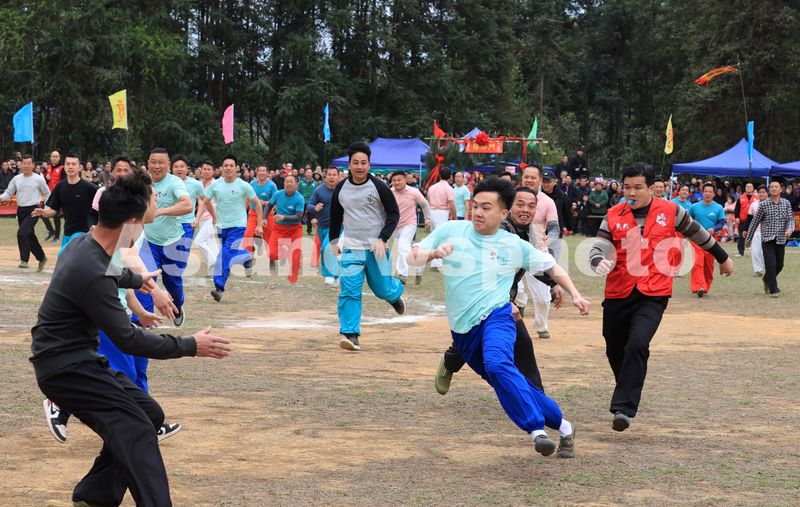 2025年3月31日,在广西柳州市融安县板榄镇,选手在参加抢花炮比赛中拼抢。当日是农历“三月三”,广西柳州市融安县板榄镇举行“三月三”传统抢花炮,来自桂黔两省的28支花炮队(其中男队17支,女队11支),在花炮场展开激烈角逐,通过抢花炮,庆祝广西民族传统节日“三月三”。