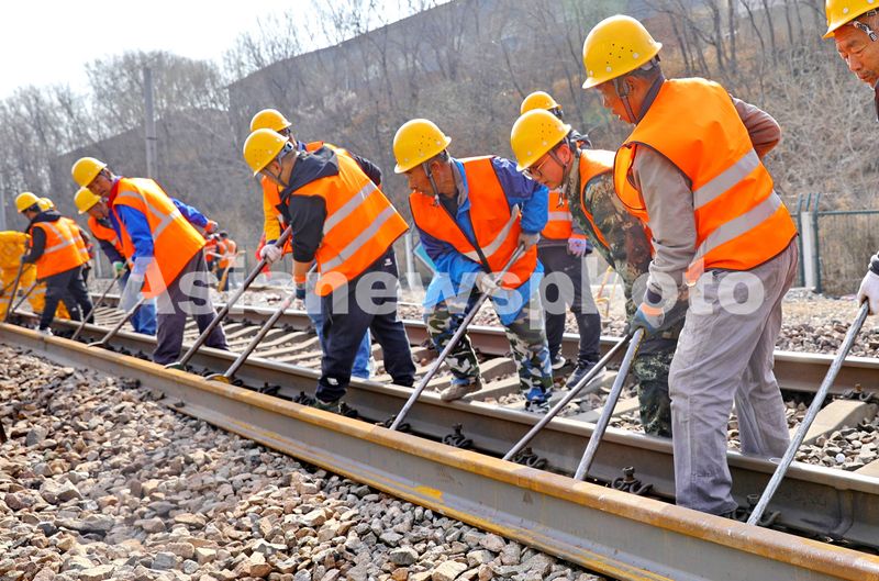 2025年4月1日,中国铁路太原局集团有限公司秦皇岛西工务段职工在大秦铁路进行更换钢轨作业。