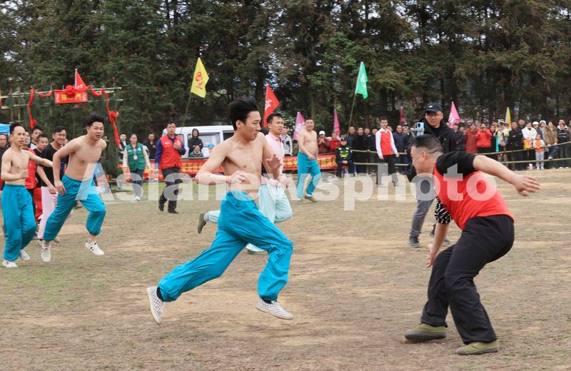 2025年3月31日,在广西柳州市融安县板榄镇,选手在参加抢花炮比赛中拼抢。当日是农历“三月三”,广西柳州市融安县板榄镇举行“三月三”传统抢花炮,来自桂黔两省的28支花炮队(其中男队17支,女队11支),在花炮场展开激烈角逐,通过抢花炮,庆祝广西民族传统节日“三月三”。