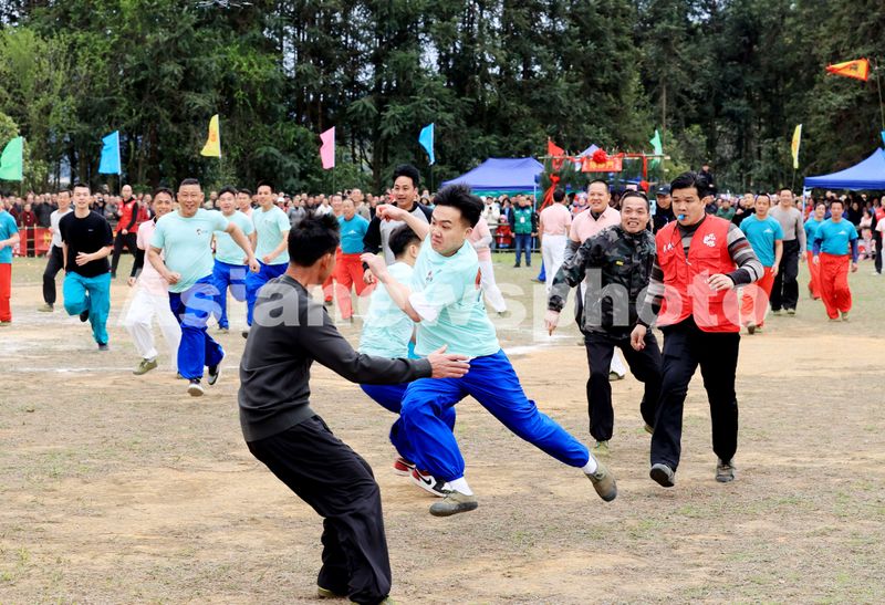 2025年3月31日,在广西柳州市融安县板榄镇,选手在参加抢花炮比赛中拼抢。