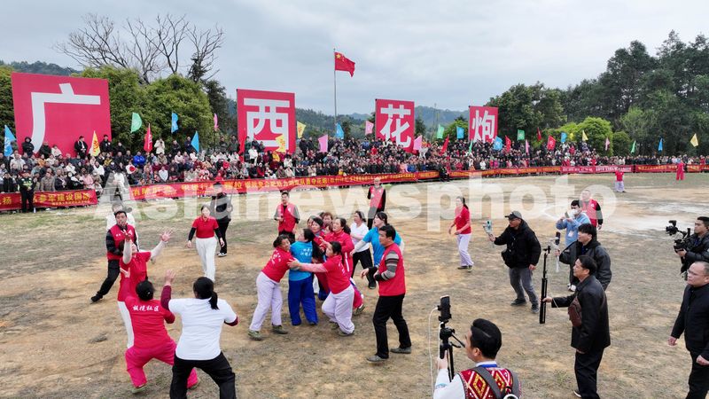 2025年3月31日,在广西柳州市融安县板榄镇,选手在参加抢花炮比赛中。(无人机照片)