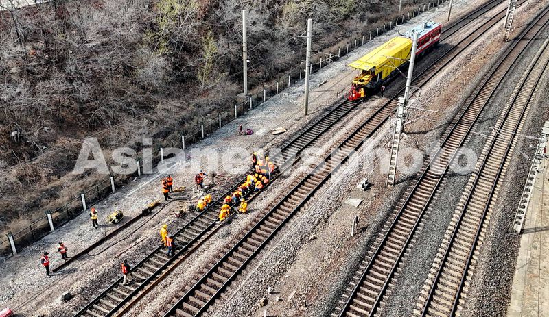 2025年4月1日,中国铁路太原局集团有限公司秦皇岛西工务段职工在大秦铁路进行更换钢轨作业。