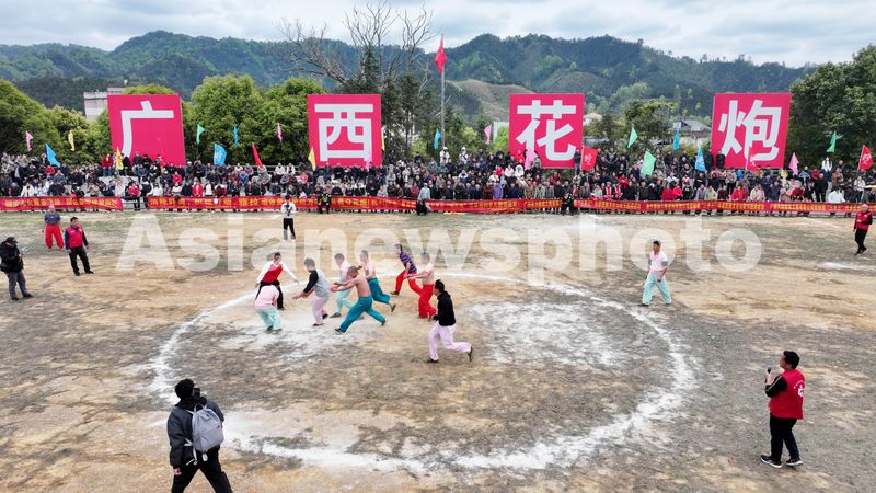 2025年3月31日,在广西柳州市融安县板榄镇,选手在参加抢花炮比赛中。(无人机照片)