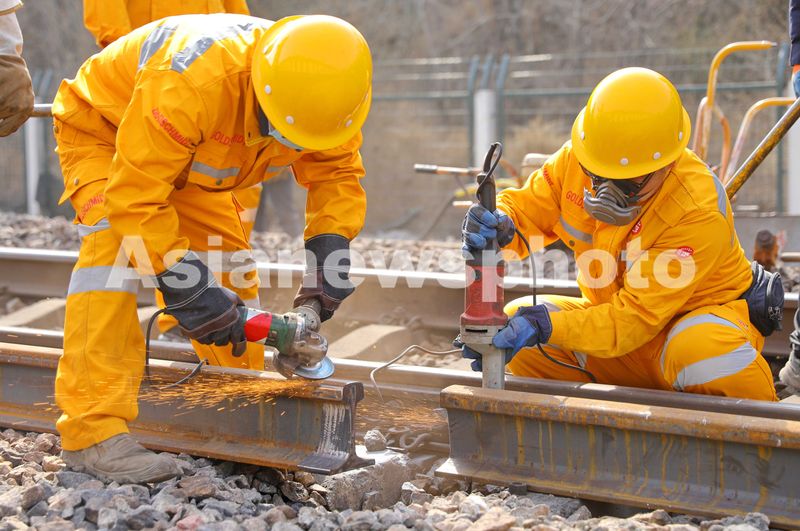 2025年4月1日,中国铁路太原局集团有限公司秦皇岛西工务段职工在大秦铁路进行更换钢轨作业。
