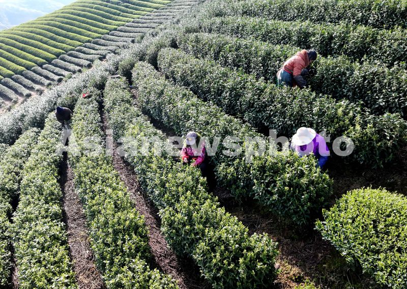 2025年4月2日,浙江省金华市武义县壶山街道正新屋村茶农在石鹅湖茶园抢采明前茶。