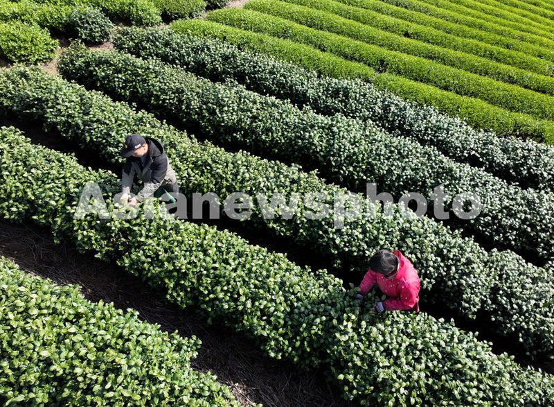 2025年4月2日,浙江省金华市武义县壶山街道正新屋村茶农在石鹅湖茶园抢采明前茶。